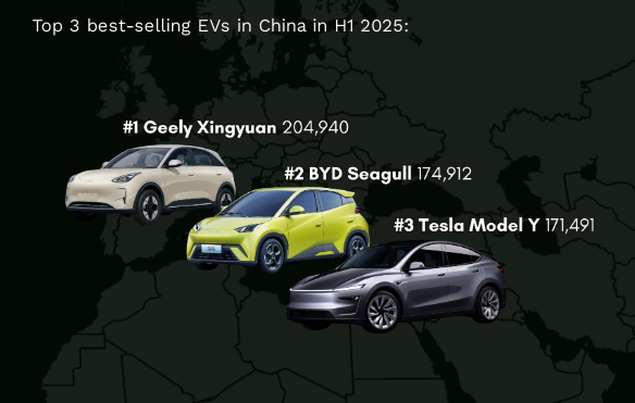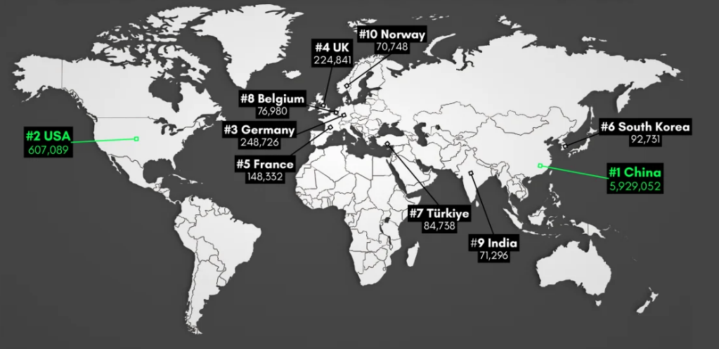 استحوذت الصين على ٥.٦٥٪ من إجمالي مبيعات السيارات الكهربائية عالميًا في النصف الأول من عام ٥٢٠٢. مع بيع ٨٠٨,٩٤٣,٣ سيارة كهربائية في الصين، نمت بنسبة ٧.٣٤٪ في النصف الأول من عام ٥٢٠٢، مقارنةً بالنصف الأول من عام ٤٢٠٢.